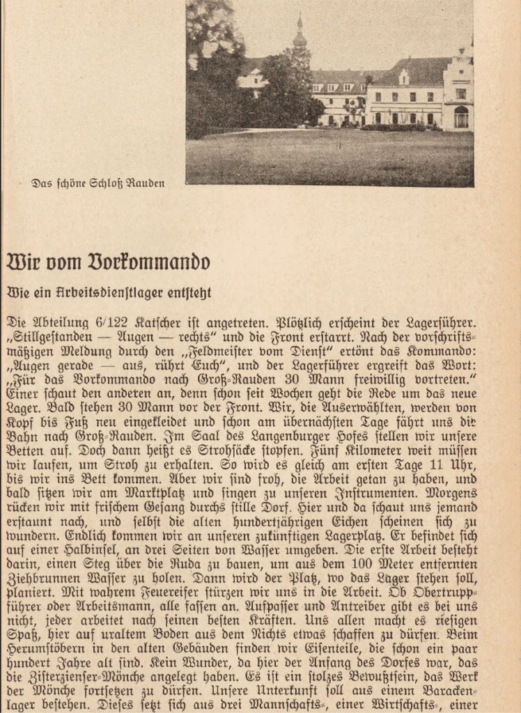 Przeglądając czasopisma i dostępną literaturę z tamtego okresu, natrafiłem na artykuł, który opisuje, kto, kiedy i jak budował pierwszy obóz RAD w Rudach. Poświęciłem trochę czasu, zrobiłem transliterację i przetłumaczyłem go. Dla mnie wniósł on sporo ciekawostek na temat obozu RAD 4/122 Groß Rauden.